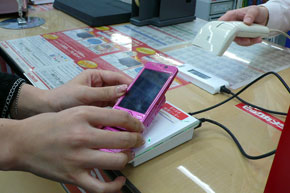 ビックカメラ有楽町店に設置された登録用リーダー/ライター(左)。おサイフケータイをかざすと(中)、三者間通信機能を利用して登録用のメールアドレスが送られる(右)