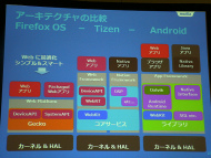 Firefox OSはHTML5と標準のWebAPIで構成してOSによる中間層は不要のため軽いOSとできる(写真=左)。メーカーもキャリアもカスタマイズが可能なため、ユーザーにより近い存在となれる(写真=中央)。用意したFirefox OS対応アプリを配布するFirefox Marketplaceも用意する(写真=右)Mozilla Japan テクニカルマーケティングの浅井智也氏は、Firefox OSのアーキテクチャ概要を説明した。浅井氏は、AndroidやTizenと異なり、カーネルとHALの上にフレームワークを必要とせず、カーネルとHALの上に直接おいたGeckoエンジンからWebアプリを動かすことで、Firefox OSは“軽いOS”を実現したと述べる。