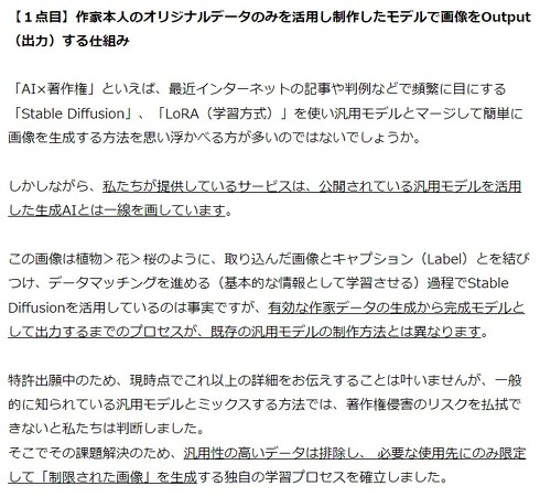 キム ピュアモデルAIにおける、Stable Diffusionの活用方法については特許とも関わっているため、詳細については申し上げ難いです。簡単に説明すると、ピュアモデルAIは、Stable Diffusionをベースに契約済みの作家の絵柄だけで出力するようにファインチューニングしたモデルです。