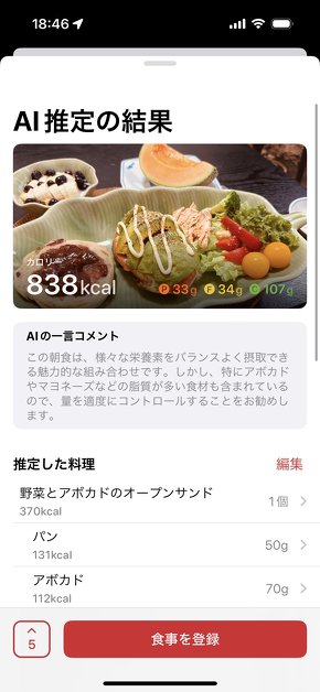 AIが画像から推定した食材や量から、カロリーや栄養素を算出することも可能。AIに栄養成分表を参考にカロリーなどを推定させることで精度を高めているという。また、AIが食事内容にコメントする機能や、目標体重やその期日を決めて1日当たりの摂取カロリーを定める機能、摂取カロリーや栄養素のグラフ化機能なども備えている。