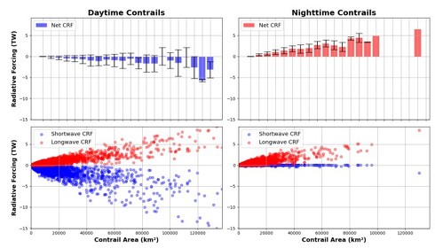 研究チームは、コントレイルの効果が昼と夜で大きく異なることも発見した。日中のコントレイルは一般に冷却効果を持ち、最大で約-8TW(テラワット)の放射強制力を示した。これは、コントレイルが太陽光を反射し、地表に届く熱を減少させるためだ。一方、夜間のコントレイルは温暖化効果を持ち、最大で6TWの放射強制力を示した。これは、コントレイルが地球からの熱放射を宇宙に逃がさず、大気中に閉じ込めてしまうためである。