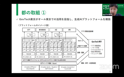 現在進めている都の取り組みとして、東京全体のDX推進を目的に設立された外郭団体であるGovTech東京の井原正博CTOが、東京都デジタルサービス局と協働して開発している生成AIプラットフォームについて説明。全庁が使える共通基盤を構築することで、隣の局が作ったAIアプリも簡単に他の局や区市町村に展開可能という。