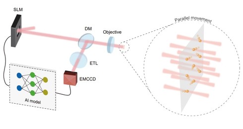新しい技術のポイントは、「光ピンセット」と呼ばれる光で原子を捕まえる装置と、空間光変調器(SLM)、そしてAIを組み合わせた点にある。まず、ランダムに捕まえた原子を目的の位置まで動かすための最適な経路を特殊な計算方法で求める。