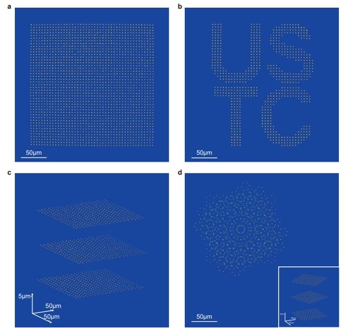 さらに、3層からなる立方体構造や「USTC」という文字を形作る2次元パターンなど、複雑な形も実現した。配置の精度も非常に高く、1回の操作で99.0%、2回の操作で99.6%という高い成功率を達成している。