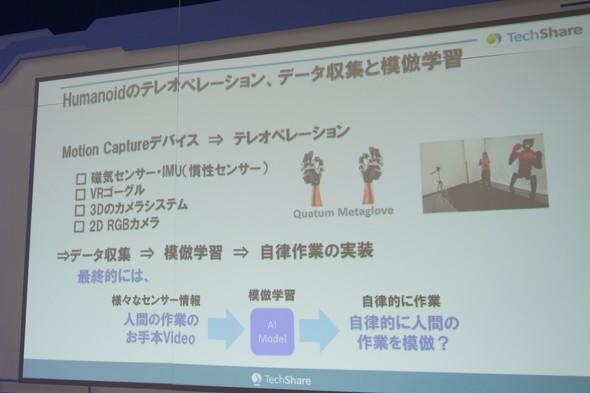 そこで人間の操作データ――例えば遠隔操作やモーションキャプチャーから得られる指の曲げ角度、力加減、カメラ映像などをAIに学習させ、ロボットが自然な作業動作を身に付ける狙いがある。