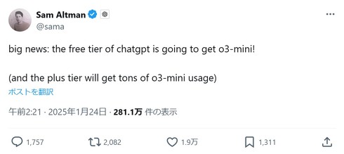 米OpenAIのサム・アルトマンCEOは1月24日(日本時間)、最新のAIモデル「o3-mini」を無料ユーザーにも開放すると、自身のX(@sama)に投稿した。