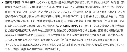 やはりDeep Researchのレポートの方が網羅的な内容となっている。しかし分量が約3000字ということで、それぞれの項目の薄さは否めない。一方でdeep researchはというと、新書本の1章程度に相当する分量で、各項目について十分な解説がなされている。例えば次のスクリーンショットは「江戸の闇社会」の一部なのだが、このようなエピソードトークが各所にちりばめられており、読み物としても楽しめるレポートとなっていた。
