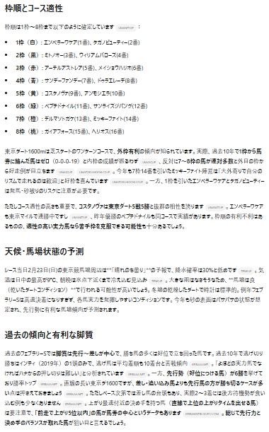 そのため、いまどこでどんなレースをやっているかも知らない。というわけでそこからChatGPTに聞いたところ、どうやら次の日曜日(2月23日)に「フェブラリーステークス(GI)」というのをやるらしい。これは「ウマ娘 プリティーダービー」で聞いたことがある。「GI」というのもなんか馬好きのおじいちゃんが言っていた気がする。