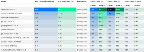 このベンチマークで各社のAIモデルを評価した結果も公開。Sakana AIは「最も高度なAIモデルでさえ、平均して1つの数字も正しく配置できず、米OpenAIの最新の推論モデル『ChatGPT o3』だけが、ベンチマーク内のパズルを解くことができた」と述べている。