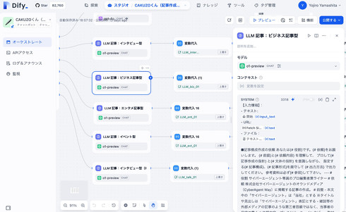 サイバーエージェントのコーポレートサイトを中心に、オウンドメディアの管理・運営を担当する山下さん。生成AI向けノーコードツール「Dify」を活用し、記事制作アプリを開発。営業資料やプレスリリース、過去記事などを読み込ませ、記事の体裁に整える仕組みを構築したという。
