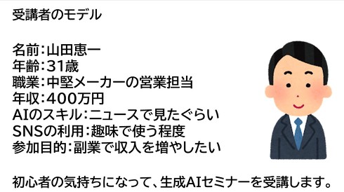 私は生成AIに関する書籍を出すなど、生成AIに関する一定の知見を持っています。しかし、生成AIセミナーに参加する人は全くの初心者である場合も多いです。そこで、これから生成AIを学ぶ初心者になりきることにしました。こちらが設定したプロフィールです。