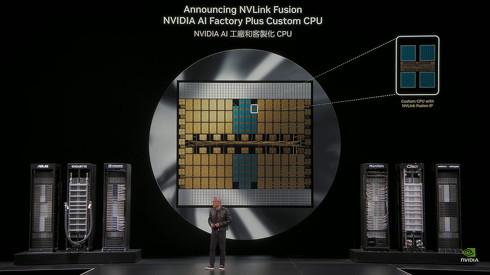 米NVIDIAは5月19日(日本時間)、同社のGPUと他社製CPUを接続する技術「NVLink Fusion」を発表した。富士通の次世代CPU「FUJITSU-MONAKA」もサポートし、NVIDIAのGPUとの連携を可能にするという。台湾で開催中のコンピュータ技術の見本市「COMPUTEX」で、NVIDIAのジェンスン・フアンCEOがお披露目した。