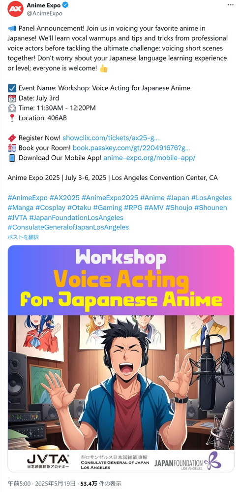 19日のポストで取り上げていたのは、プロの声優から指導を受け、日本語でアニメのアフレコ体験をするワークショップ。添付画像はアフレコをイメージしたとみられ、ヘッドフォンを付けているキャラクターが、機材やアニメのポスターに囲まれている様子が描かれていた。