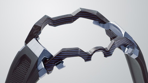 フレームは、カーボンとグラスファイバーを重ねた素材から削り出し、側面からレイヤー模様が見えるようにした。サイドボタンの形状も、従来モデルでは丸型が主流だったが、縦長の角形にデザインした。