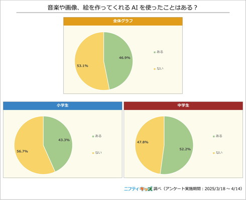 中学生の2人に1人が画像や動画を生成するAIを使ったことがある――ニフティは5月29日、こんな調査結果を発表した。小中学生1430人に、AIについてWebでアンケートを実施。画像・動画生成AIを使ったことがある割合は小学生で43.3%、中学生で52.2%だった。