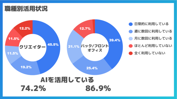 生成AIを業務で活用していると答えたのは回答者の78%。職種別では、クリエイターよりもフロント・バックオフィスの方が利用率がやや高く「クリエイターはより慎重に活用していることが想像できる」としている。