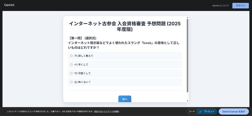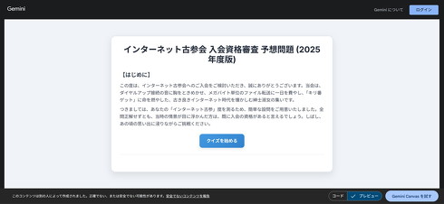 Google日本法人は6月1日、ユーザーの“インターネット古参度”を測る問題集を公式Xで公開した。その名も「インターネット古参会 入会資格審査 予想問題 (2025年度版)」。米GoogleのチャットAI「Gemini」内で、AIと会話しながら文章作成やプログラミングができる機能「Canvas」を活用して作成したという。