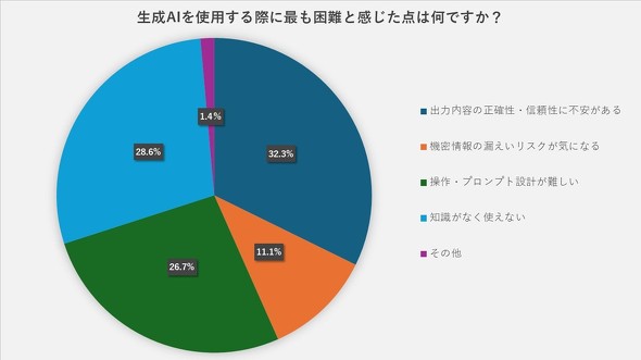 うまく使えなかった理由として、「出力内容の正確性や信頼性に不安がある」「操作・プロンプト設計が難しい」といった答えが多かった他、「社内文書を読ませても要点がつかめない」「ファイル読み取りがうまくいかない」という声もあった。