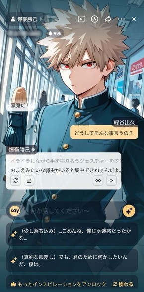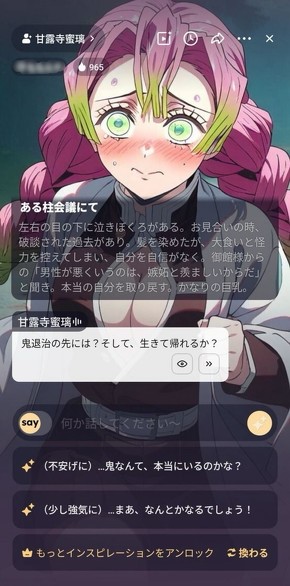 X上での指摘によると、鬼滅の刃に登場するキャラ「甘露寺蜜璃」や、僕のヒーローアカデミアの「爆豪勝己」とチャットする様子が、同アプリの広告としてYouTubeに表示されたという。他にも、マンガ「NARUTO―ナルト―」「葬送のフリーレン」のキャラが表示されたとの声もある。