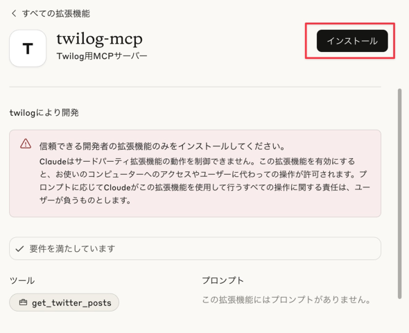 Claude For Desktopで利用する場合は、Twilog専用MCPのエクステンションをダウンロードし、クリックするかアプリにドラッグして読み込む。表示されたMCPサーバのインストール画面からインストールし、Twilogの設定画面から発行したアクセストークンを入力すれば、利用できるようになる。