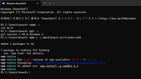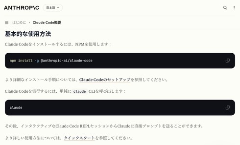 Claude CodeをWindows機で利用するには、オープンソースのJavaScript実行環境「Node.js」と、分散型バージョン管理システム「Git for Windows」が必要。Claude Codeは、Node.jsのパッケージマネジャー「npm」でインストールする。詳細なセットアップの手順は、同社の公式サイトで確認できる。