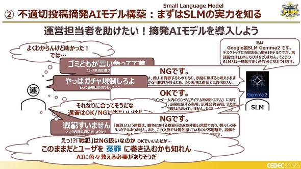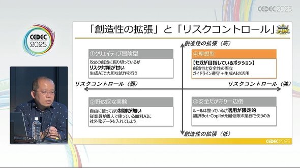 CEDEC2025では、セガやCygames、カプコンなどが生成AIに関する講演を実施。例えばセガは、社内におけるAI活用の環境整備について講演した。さらに、ChatGPTのようなクラウド上で動作するAIだけでなく、手元のPCで動く「ローカルAI」の活用を進めていることも明らかに。オンラインゲームのプレイヤーによる不適切な発言のチェックなどに活用しているという。