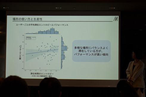 他にも、パフォーマンスが高い人同士、低い人同士が同じエリアに集まる傾向があることが分かったと大西氏。現在は、特定エリアでの作業がパフォーマンス向上につながるという相関関係を検証するため、実際に社員に特定エリアで1時間以上作業してもらい、その効果を分析中としている。