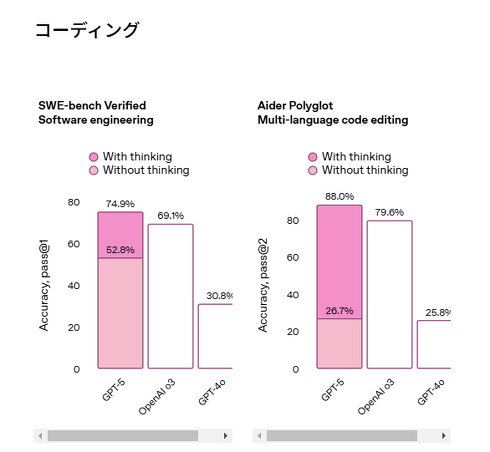 同社はGPT-5の性能について「これまでで最もスマートで、最も速く、最も便利なモデル」と説明。コーディングや数学、ライティング、医療、視覚認識などあらゆる分野で優れた性能を発揮するという。そのベンチマークは、数学とコーディング、マルチモーダル、健康の分野で新たな最高水準(SOTA)を達成した。