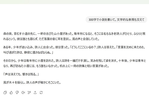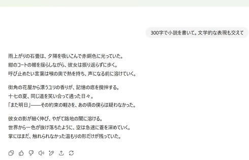 果たして、次世代AIが考える“文学的”な文章とは何なのか。「300字で小説を書いて。文学的な表現も交えて」と入力した結果がこちらだ。