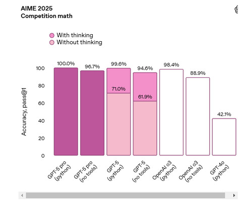 では、GPT-5の性能とはどの程度のものなのだろうか。実際のところ、GPT-5は各種ベンチマークで優秀な成績を収めている。例えば、AIME(American Invitational Mathematics Examination、米国の高校生向け数学コンテスト)2025の問題において、GPT-5は補助ツールを使用しない状態で94.6%というスコアを記録したという。