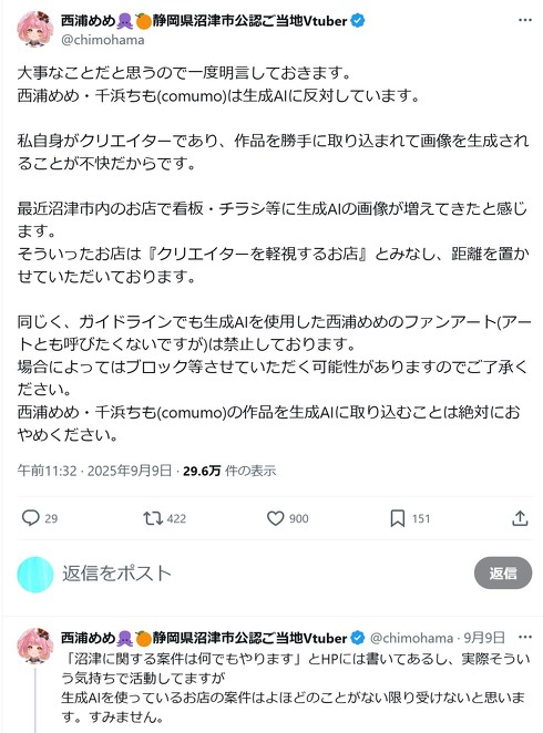 画像生成AIを利用する店は「クリエイターを軽視する店」と見なし、距離を置く――静岡県沼津市公認のVTuberである西浦めめさんの発言が物議を醸している。西浦さんは9月9日、自身のXアカウント(@chimohama)で「生成AIに反対している」との声明を発表。声明を巡り、沼津市にも見解を聞いたところ「市の見解ではない」との回答が得られた。
