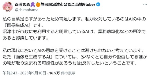 これを受け、西浦さんは10日に「私が反対しているのはAIの中の『画像生成AI』」と補足。「沼津市が市政にも利用すると明言しているAIは、業務効率化などの用途であると認識している」とした。一方、X上では「なぜ画像生成AIはダメで、テキスト生成AIなど他のAIは良いのか」といった指摘が出るなど、物議を醸している。