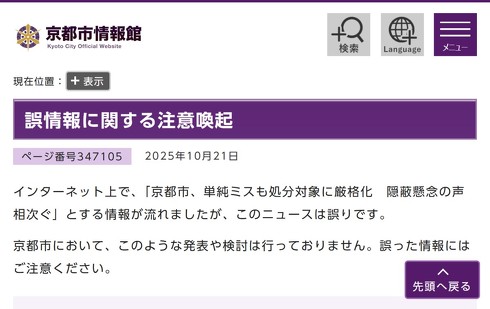 「SNSではすぐに(情報が)拡散されるので、正しい情報を発信してほしい」――京都府京都市の広報担当者は10月22日、X上に誤情報が掲載された件に対し、このように指摘した。同市は21日、「京都市、単純ミスも処分対象に厳格化 隠蔽懸念の声相次ぐ」との誤情報を確認したとして、公式Xなどで注意を呼び掛けていた。
