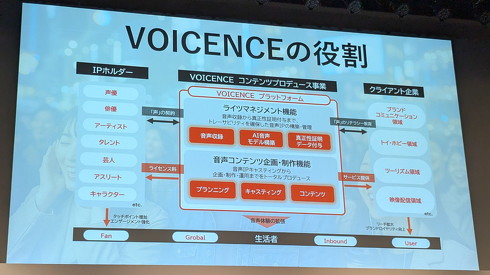 VOICENCEでは、提供された声のデータと、それを学習したAIモデル、同モデルで生成したAI音声をまとめて“音声IP”として管理しつつ活用できる。AI音声には、ブロックチェーン技術とデジタル証明書「Verifiable Credential」(VC)を活用し、無断で生成されたAI音声ではないことを証明するデータを付与。証明データの改ざん耐性を高め、データの親子関係を記録・追跡できるようにしたという。