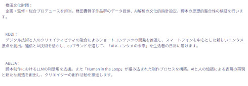 前作ドラマの作成時には、渡鬼の脚本をデータ化。橋田さんが描く登場人物像や人物間のコミュニケーションの設計、せりふの言い回し、ストーリーの展開などをLLMに学習させていた。今回も脚本にはAI橋田壽賀子を活用しており、KDDIは「AIは脚本家の“発想の壁打ち相手”として機能し、人間の創造性を拡張する新しい創作スタイルを形成する」と、人とAIの協業による優位性を説明している。