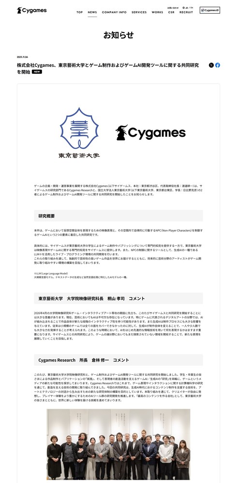 Cygamesは11月6日、同社の研究部門「Cygames Research」と東京藝術大学が共同で、ゲーム開発で利用する生成AIツールに関する研究を始めたと発表した。Cygamesがゲーム制作で得た知見と、東京藝術大学の映像表現やゲームで利用するAIに関する学問知を組み合わせる。ゲーム制作で活用するAIツールの開発などに取り組む。