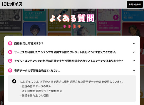 にじボイスは、Algomaticが2024年12月に正式にリリースしたAI音声サービス。「声の権利を守るためのプラットフォーム」をうたい、AIの学習には「適切に権利処理された音声データのみを使用している」としていた。