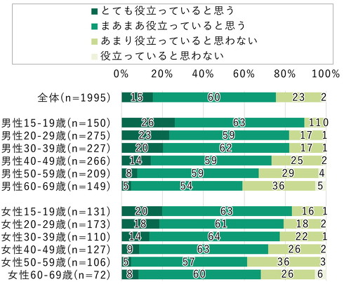 なお、生成AIがどれほど役立っているか、単一回答で聞いたところ「役立っていると思う」と考える意見が75%を占めた。若年層ほど役に立っていると回答する傾向があり、10代男性が89%で最多だった一方、60代男性は59%で最も少なかった。