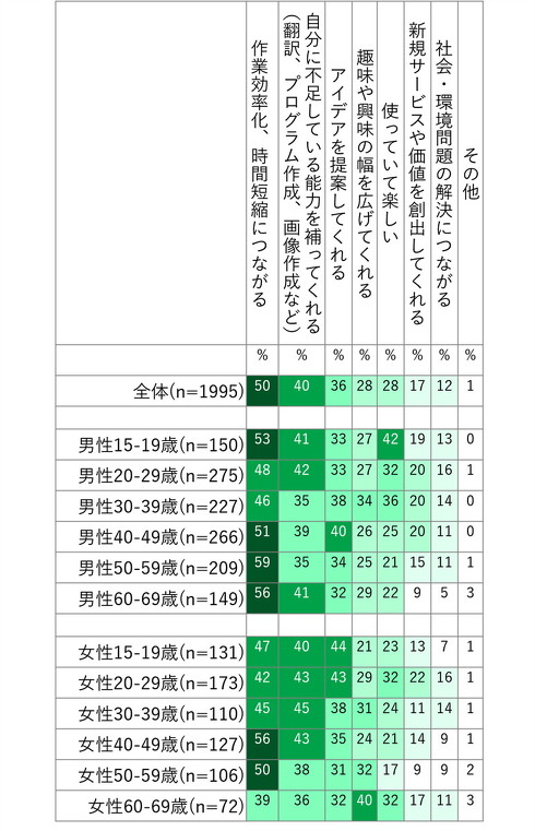 アンケートは2月、全国の15〜69歳の男女にWebで実施したもの。有効回答は7527件あり、そのうち生成AIを利用すると答えた1995人を対象に、今回の質問を聞いた。