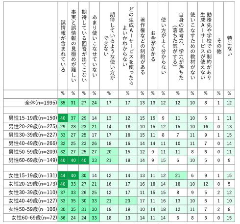 年代や性別ごとに見ると、20代男女では不満点として「勤務先や学校での制約があり生成AIサービスが使えない」と回答する割合が、他の年代に比べて高い傾向があった。また、10代女性では「自身の思考力、学力が落ちた(落ちた気がする)」という回答が21%あり、全世代・性別で唯一2割を超えた。