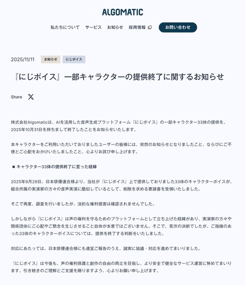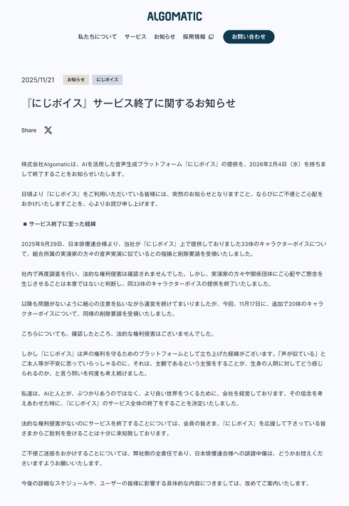 「にじボイスは声の権利を守るためのプラットフォームとして立ち上げた。『声が似ている』と本人などが不安に思っているのに、それは、主観であるという主張をすることが、生身の人間に対してどう感じられるのか、という問いを何度も考え続けた。私達は、AIと人とが、ぶつかりあうのではなく、より良い世界をつくるために、会社を経営している。その信念を考えあわせた時に、サービス全体の終了をすることを決定した」(Algomatic)