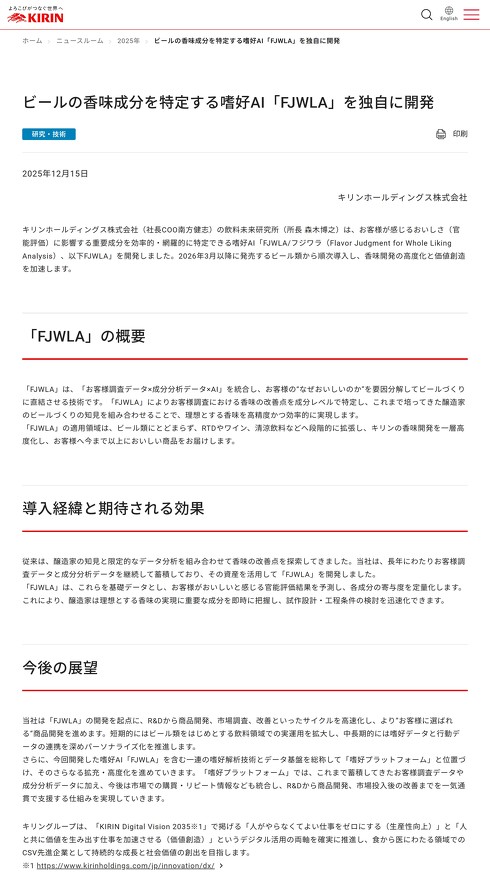 キリンホールディングスは12月15日、ビール類の開発に独自AI「FJWLA」(フジワラ、Flavor Judgment for Whole Liking Analysis)を活用すると発表した。香味の開発を効率化する。2026年3月以降に発売のビール類から順次導入する予定。