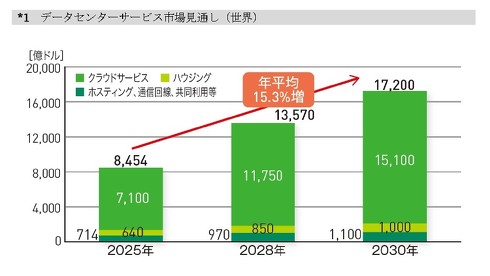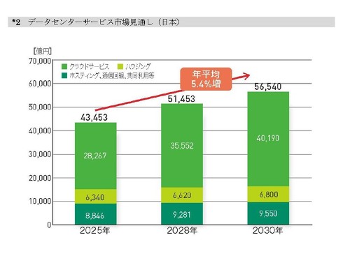 25年から30年にかけ、世界のデータセンターサービス市場は、年平均15.3%増加すると予測する。AI関連の需要に加え、クラウドサービスの利用や、動画配信・ゲームなどのデジタルコンテンツの需要拡大を見込む。日本のデータセンターサービス市場も堅調に推移し、25年の4兆3453億円から、30年には5兆6540億円に達するとしている。