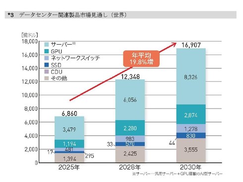 データセンターサービス市場の成長に伴い、GPUや冷却装置、サーバなどをはじめとした関連製品市場の拡大も予測する。世界の市場規模は、25年の6860億ドル(105兆6440億円)から、30年には1兆6907億ドル(260兆3678億円)となり、約2.5倍に伸長するという。
