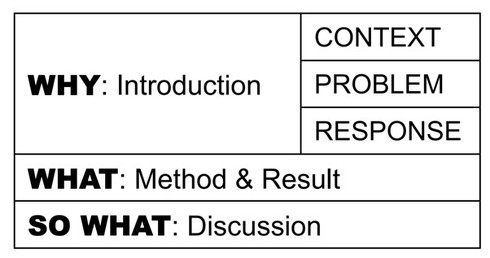IMRADの形式に当てはめれば、IntroductionではWhy、MethodとResultではWhat、DiscussionではSo Whatに答えることになる。日本語話者は「いちいち説明しなくても伝わるはず」と考えがちだが、英語圏ではそうした期待は通用しない。WhyとSo Whatこそ、ことさらに明確な詳述を必要とする。