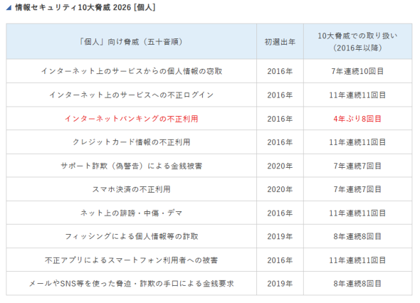 個人部門は例年通り順位付けをしない形で選出した。IPAは「脅威のラインアップに大きな変化はないが、脅威の呼称が同じであっても、常に手口は巧妙に変化し続けている」と注意喚起している。