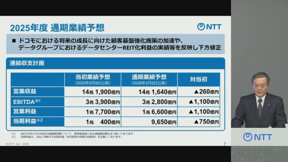 ただし、NTTドコモにおいてネットワーク品質改善や顧客基盤強化に想定以上の費用投下を見込むことなどから、通期業績予想は下方修正。営業収益を14兆1640億円(当初予想は14兆1900億円)、営業利益は1兆6600億円(同1兆7700億円)、純利益を9650億円(同1兆400億円)に変更する。