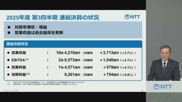 NTTの2025年度第3四半期累計(25年4月〜12月)の連結決算は、営業収益が10兆4210億円(前年同期比3.7%)、営業利益が1兆4571億円(同4.1%)、純利益が9261億円(同8.9%)と増収増益で、営業収益は過去最高だった。
