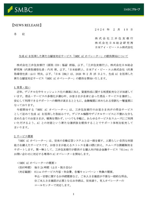 三井住友銀行は2月18日、生成AIが顧客の電話対応をするサービス「SMBC AI オペレーター」を開発したと発表した。同サービスは、24時間365日“人間らしく”対応できるという。25日から同社の個人向け金融サービス「Olive」の問い合わせ窓口に導入する。