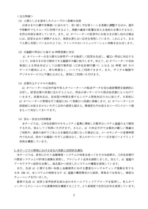 SMBC AI オペレーターの開発には、日本総合研究所と日本アイ・ビー・エムが協力した。通話相手の口調や言葉遣いに応じて、言い回しや声のトーンを調整できるほか、回答中に相手に話しかけられた際は、回答を中断して発言を聞く機能も持つ。通話に混じる雑音の影響を抑える仕組みも備え、人間同士によるスムーズな対話に近づけたという。